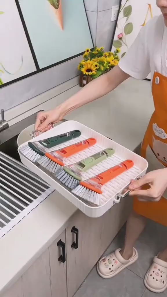 【Soap Dispensing】 Kitchen scrub brush is equipped with a 50ML super-large-capacity dispenser, and dispenses soap on demand with the light push of a button. No matter how placed, the silicone valve can prevent the dish soap from leaking
